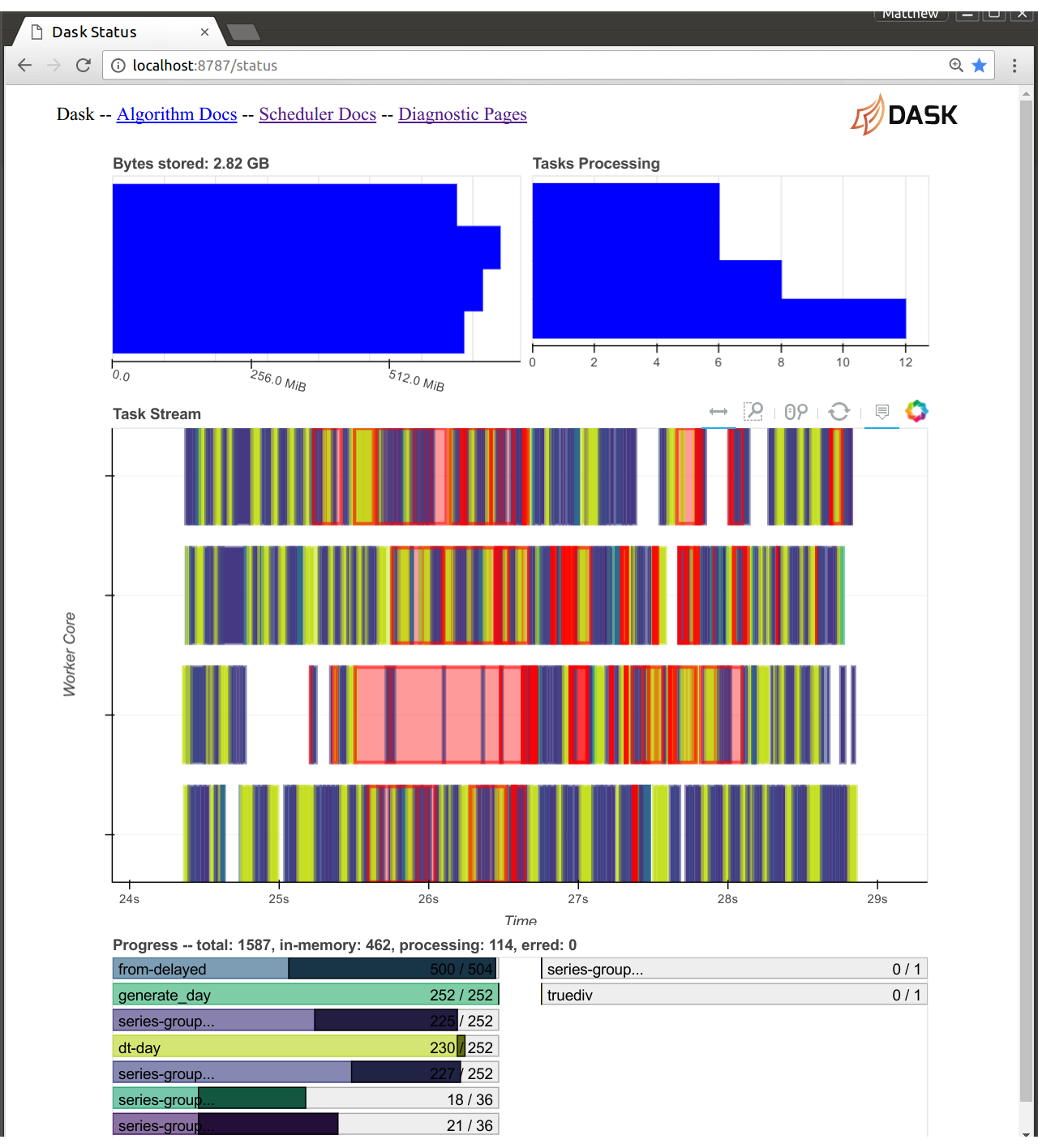 The distributed scheduler’s web diagnostic page is now served from within the dask scheduler process. This is both good and bad: