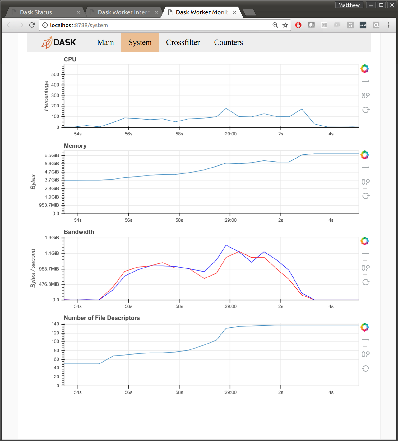 The intended computations move several terabytes across the cluster. On this cluster Dask gets about 1GB/s simultaneous read/write network bandwidth per machine using the high-speed Infiniband network. For any commodity or cloud-based system this is very fast (about 10x faster than what I observe on Amazon). However for a super-computer this is only about 30% of what’s possible (see hardware specs).