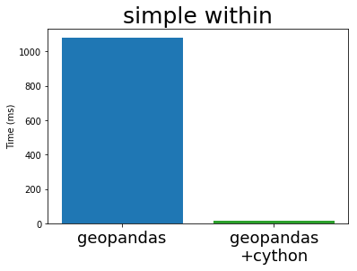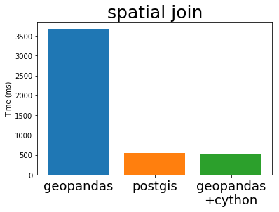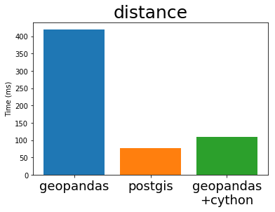 In his EuroSciPy talk Joris compares the performance of GeoPandas (both before and after Cython) with PostGIS, the standard geospatial plugin for the popular PostgreSQL database (original notebook with the comparison). I’m stealing some plots from his talk below: