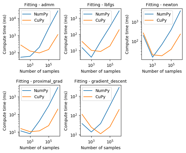Prediction with CuPy, as seen above, can be proportionally much faster than NumPy, staying mostly constant for all solvers, and around 3-4 orders of magnitude faster.