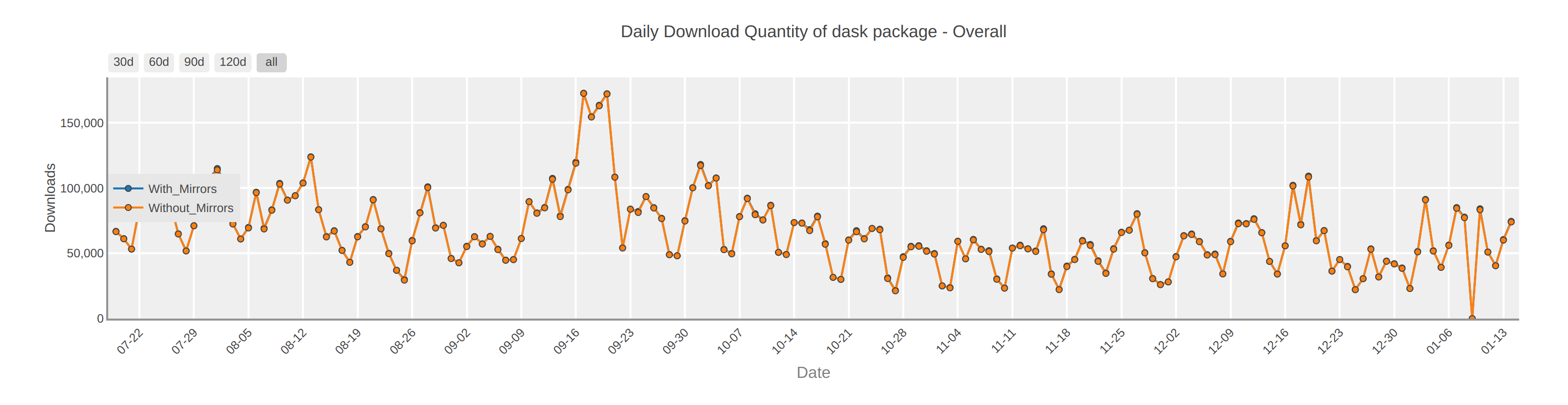 This is a huge number, but is almost certainly misleading. Common sense tells us that there are not 100k new Dask users every day.