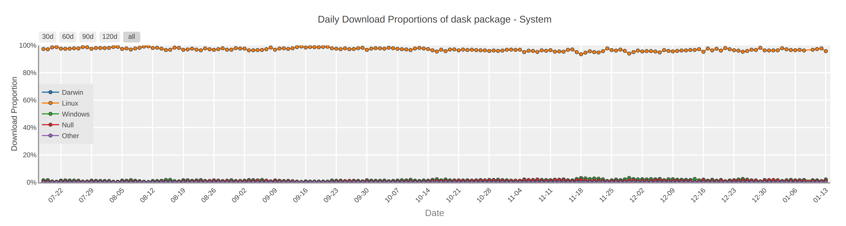 While it’s true that Dask is frequently run on Linux because it is a distributed library, it would be odd to see every machine in that deployment individually pip install dask. It’s more likely that these downloads are the result of automated systems, rather than individual users.